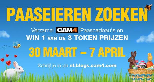 Met Pasen hoef je dit jaar geen eieren te zoeken, maar kom je gewoon lekker uitzenden op Cam4! Verdien van 30 Maart tot 7 April zo veel mogelijk Tokens met de speciale Pasen-Kadootjes. Aan het eind van de week maken we de balans op, en maken we bekend wie de gelukkige Paashaas is ! Geef je wel even op door te mailen naar Bram@Cam4.com; alleen dan wordt aan het eind van de week gekeken of je hebt gewonnen 😉