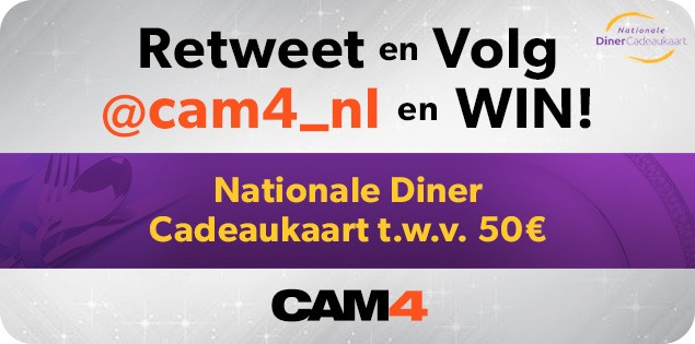 Vanaf nu kan iedere Volger van het @Cam4_NL Twitter Account kans maken op een Nationale Diner Cadeaukaart ter waarde van 50€ ! Het enige dat je hiervoor hoeft te doen is onderstaande tweet te Re-Tweeten en @Cam4_NL te volgen. Veel succes 😉